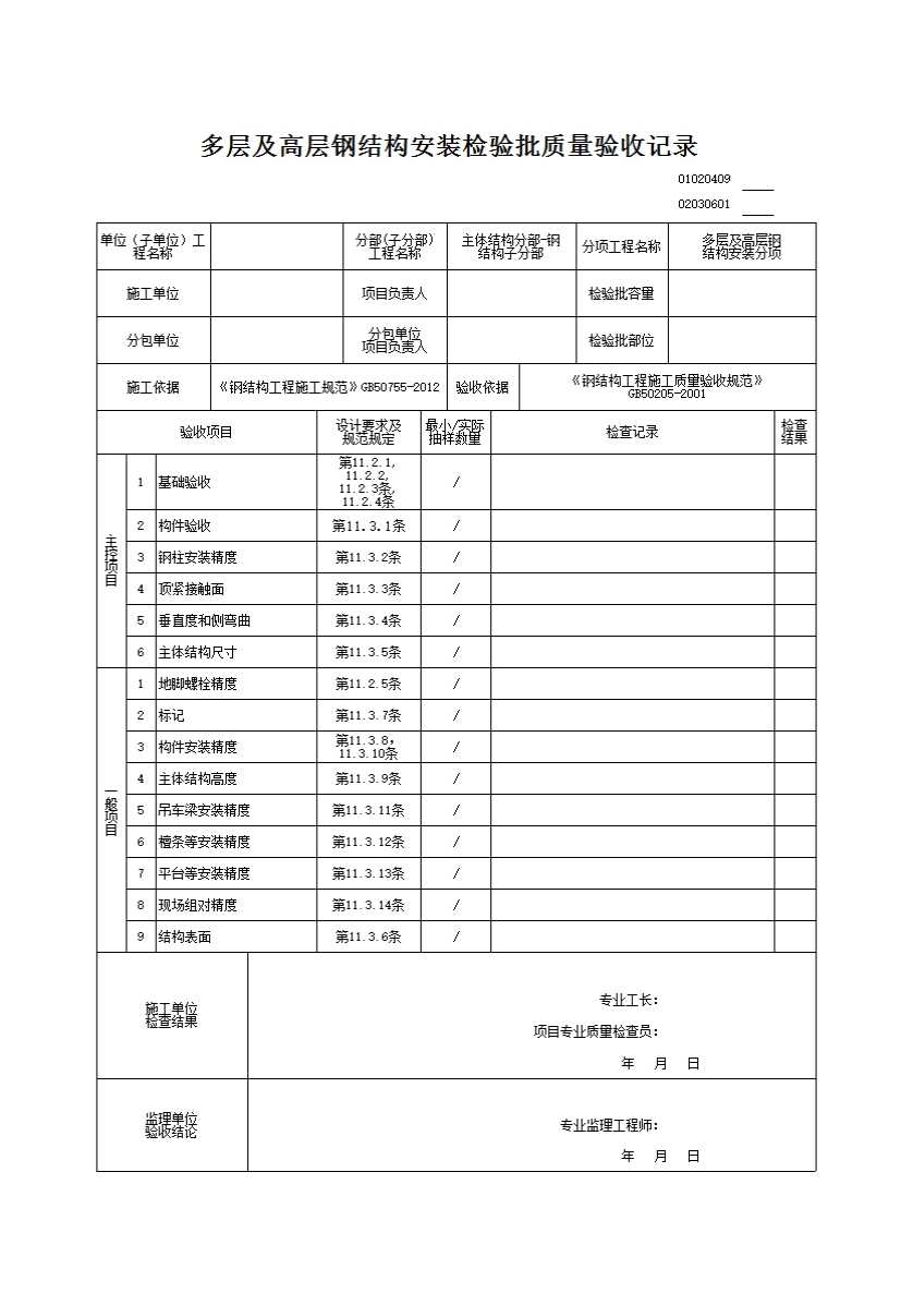 02030601_多层及高层钢结构安装检验批质量验收记录