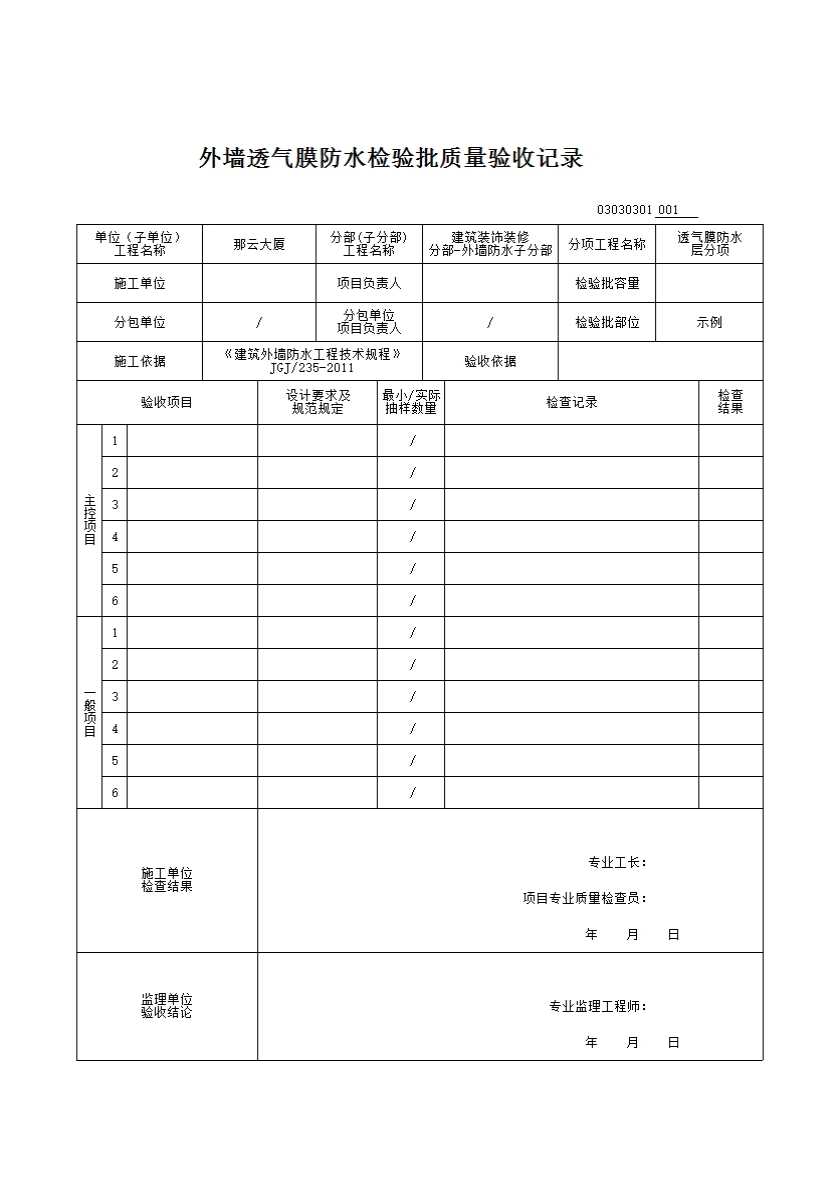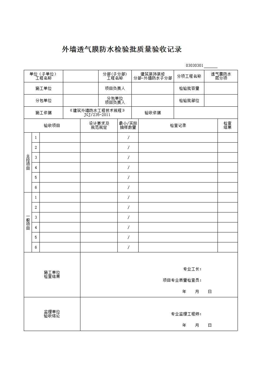 外墙透气膜防水检验批质量验收记录