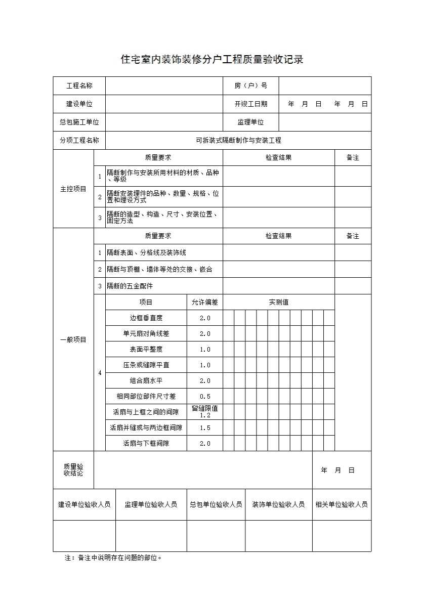 表格名称:可拆装式隔断制作与安装工程质量验收记录