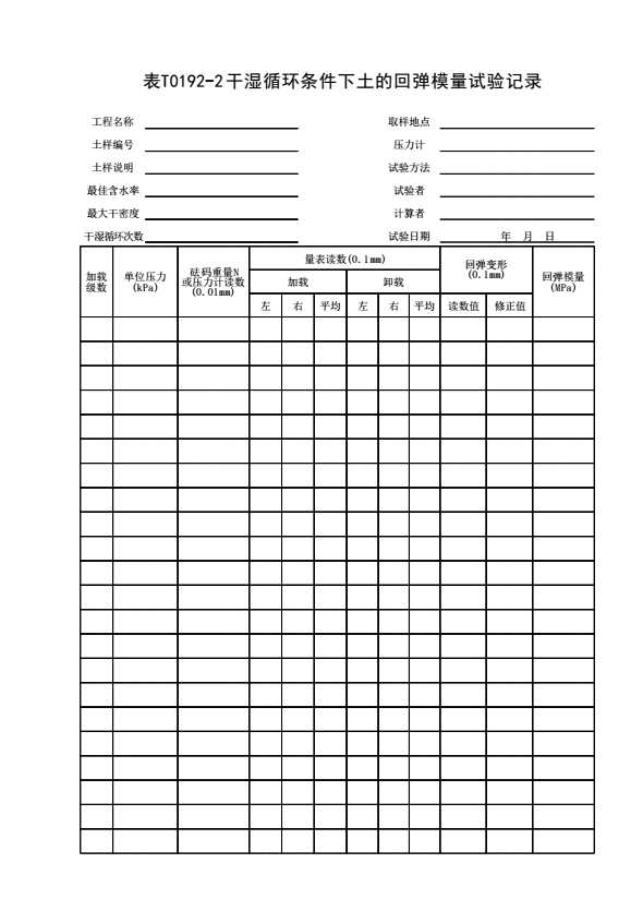 表格名称:表T0192-2 干湿循环条件下土的回弹模量试验记录