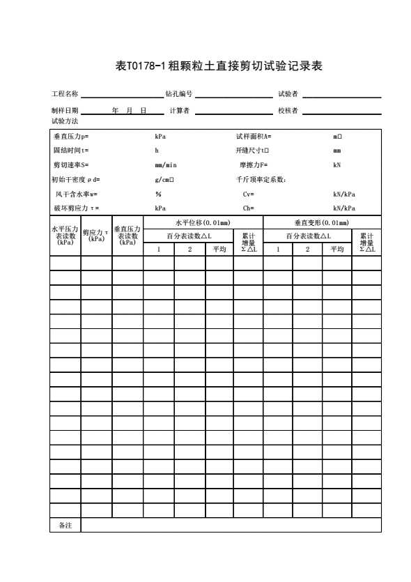 表格名称:表T0178-1 粗颗粒土直接剪切试验记录表