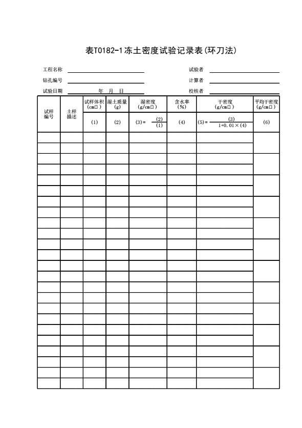 表格名称:表T0182-1 冻土密度试验记录表(环刀法)