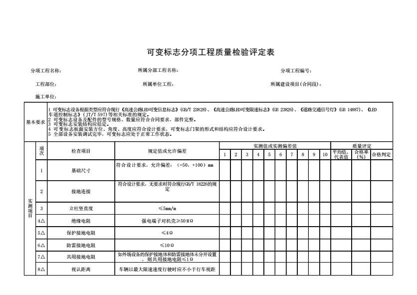 表9.9.2 可变标志分项工程质量检验评定表