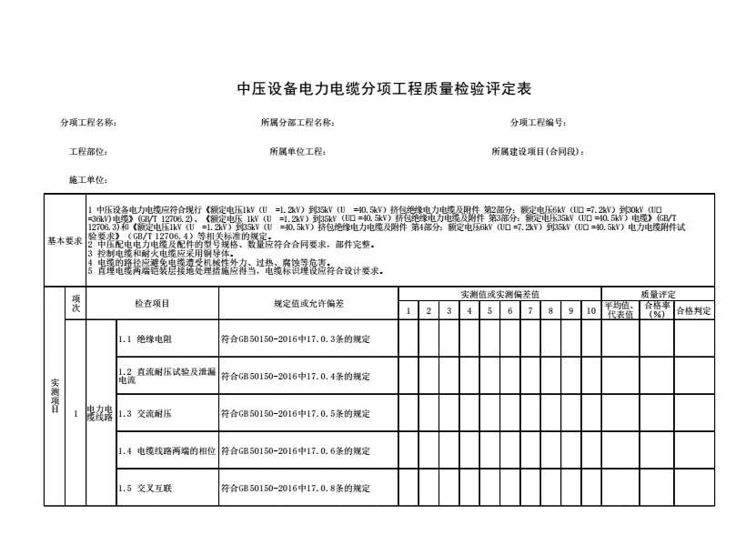 表9.19.2 中压设备电力电缆分项工程质量检验评定表