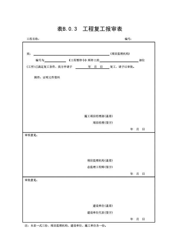 表格名称:表B.0.3 工程复工报审表