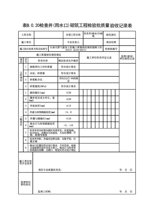 表格名称:表B.0.20 检查井(雨水口)砌筑工程检验批质量验收记录表