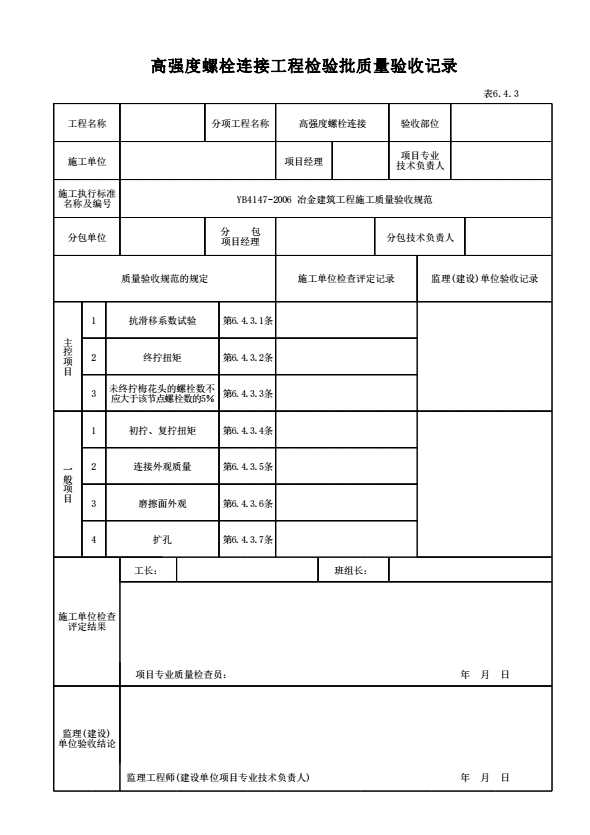 表格名称:表6.4.3 高强度螺栓连接工程检验批质量验收记录