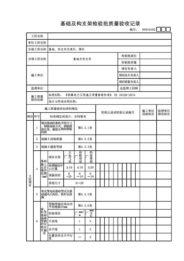 表格名称:09010102 基础及构支架检验批质量验收记录