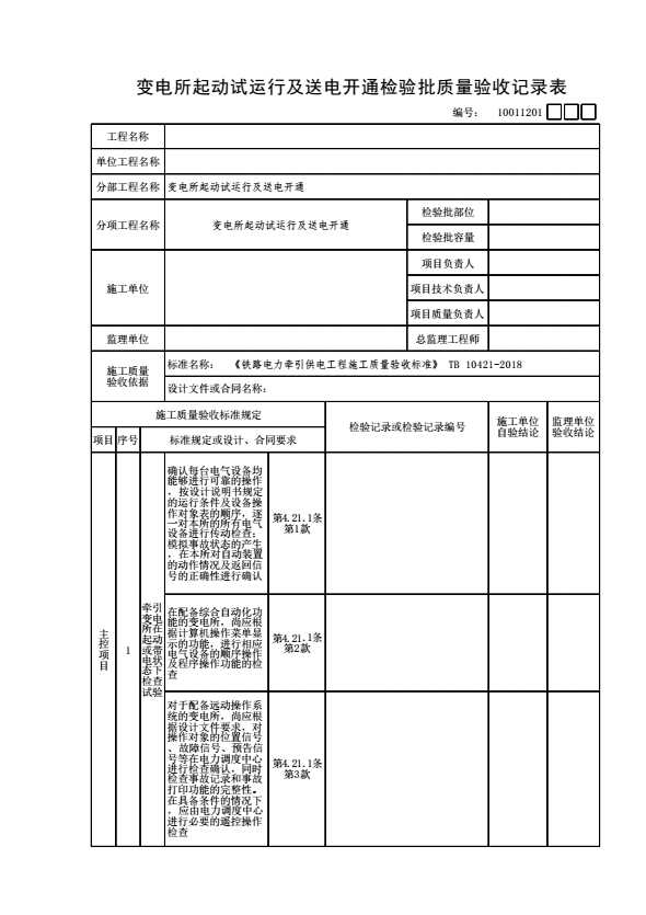 表格名称:10011201 变电所起动试运行及送电开通检验批质量验收记录表