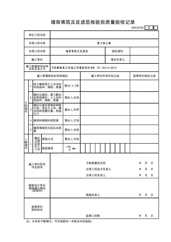 表格名称:02010705 墙背填筑及反滤层检验批质量验收记录
