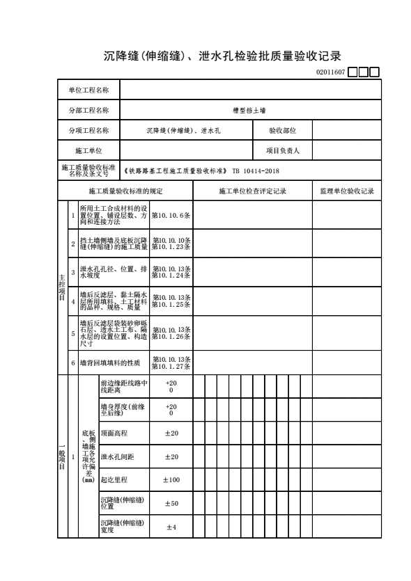 表格名称:02011607 沉降缝(伸缩缝)、泄水孔检验批质量验收记录