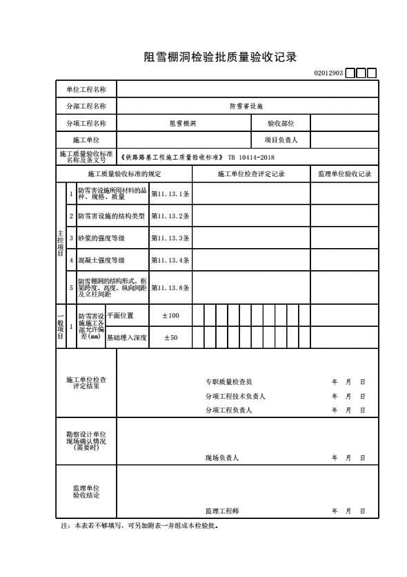 表格名称:02012903 阻雪棚洞检验批质量验收记录