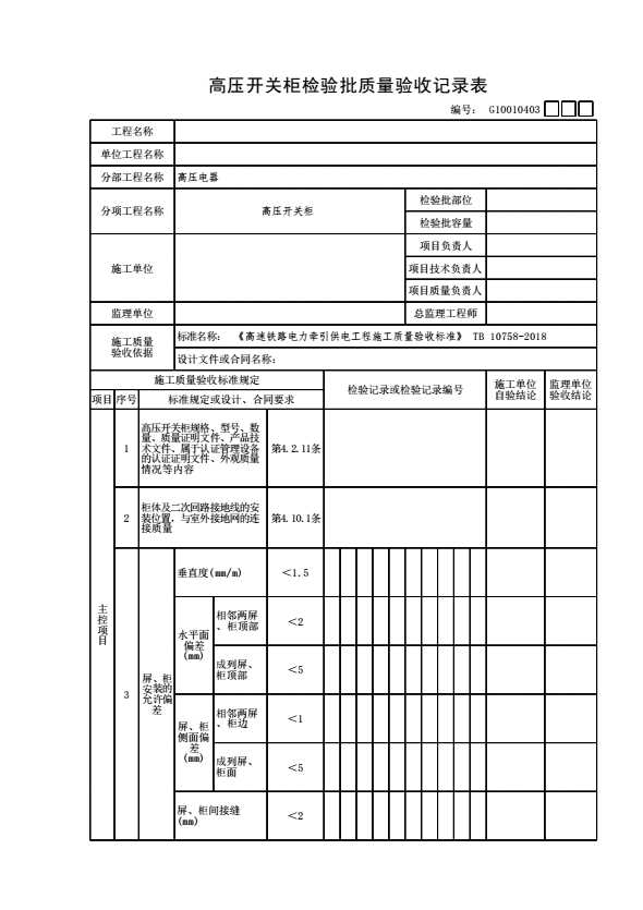 表格名称:G10010403 高压开关柜检验批质量验收记录表