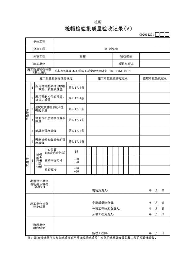 表格名称:G02011201 【桩帽】桩帽检验批质量验收记录(Ⅳ)