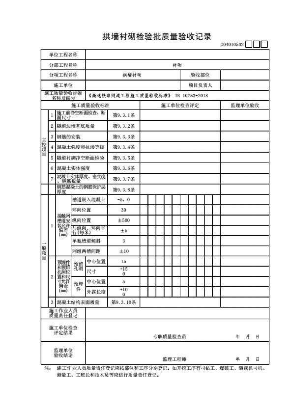 表格名称:G04010502 拱墙衬砌检验批质量验收记录