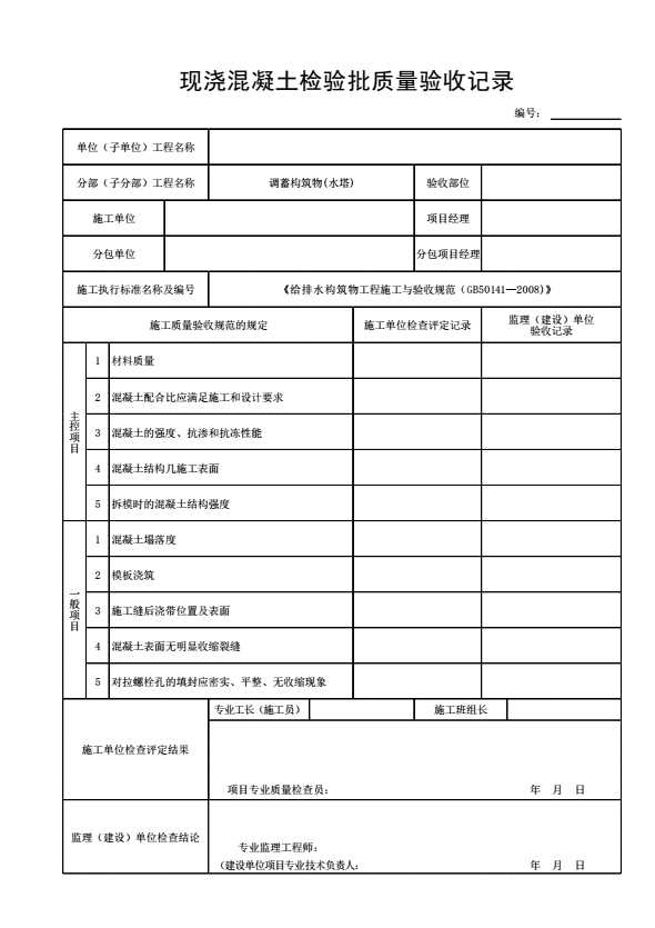 本表适用于给排水构筑物工程现浇混凝土检验批的质量检查验收。