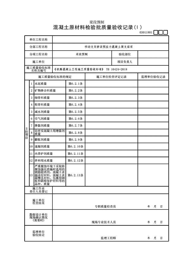 表格名称:03011801 混凝土原材料检验批质量验收记录(Ⅰ)