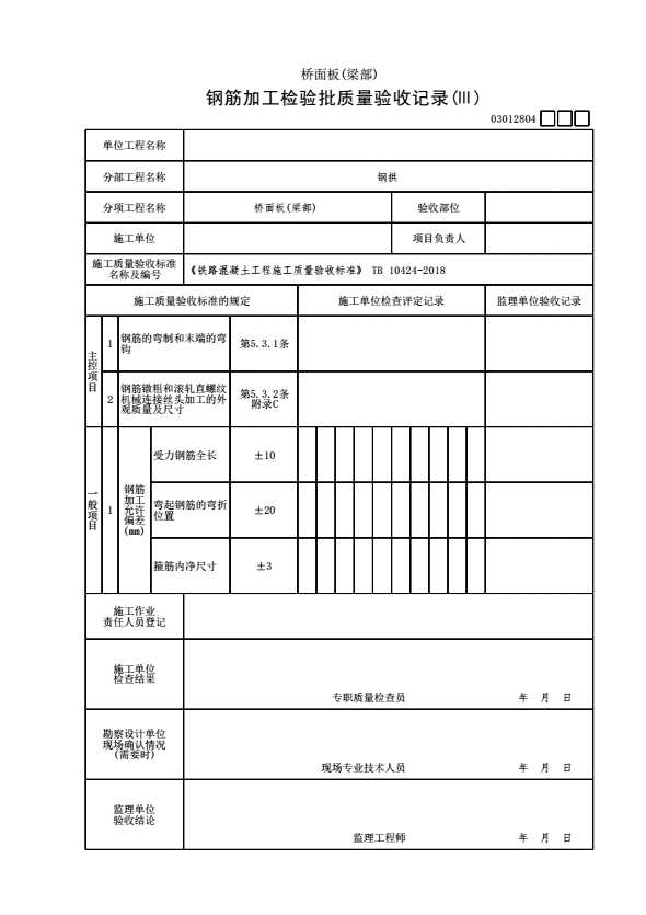 表格名称:03012804 钢筋加工检验批质量验收记录(Ⅲ)