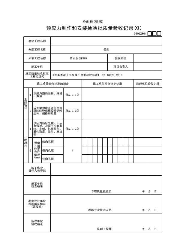 表格名称:03012804 预应力制作和安装检验批质量验收记录(Ⅺ)