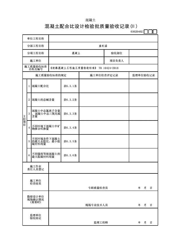表格名称:03020402 混凝土配合比设计检验批质量验收记录(Ⅱ)