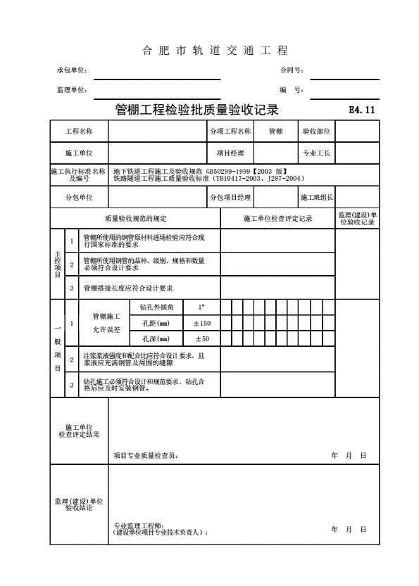 表格名称:E4.11 管棚工程检验批质量验收记录