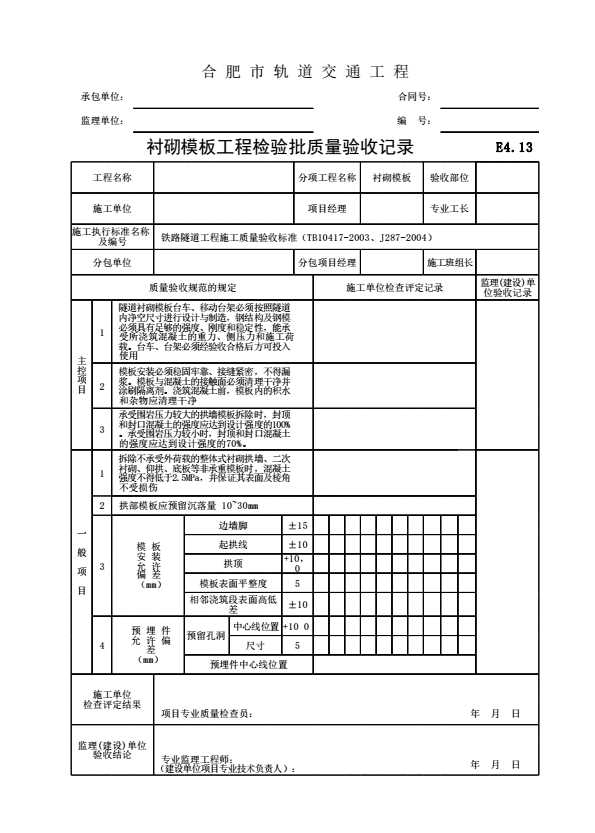 表格名称:E4.13 衬砌模板工程检验批质量验收记录