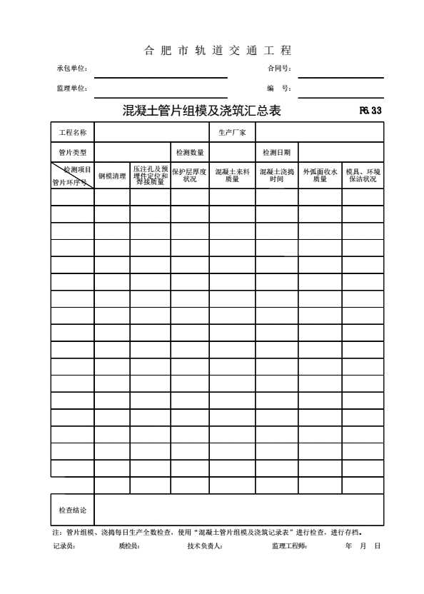 表格名称:F6.3.3 混凝土管片组模及浇筑汇总表