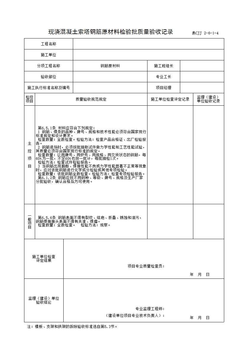 表格名称:表CJJ 2-6-1-4 现浇混凝土索塔钢筋原材料检验批质量验收记录