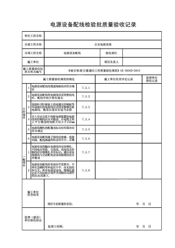 表格名称:电源设备配线检验批质量验收记录