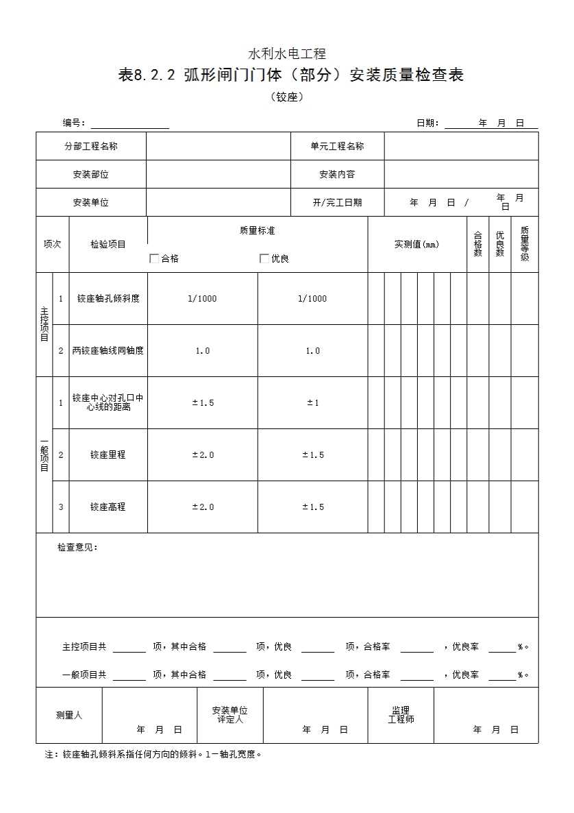 表8.2.2 弧形闸门门体(部分)安装质量检查表(铰座)
