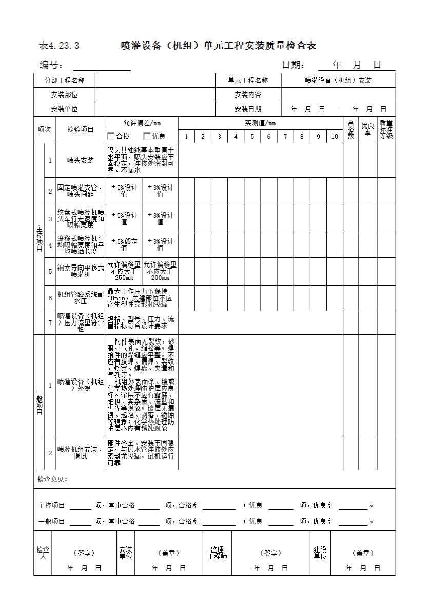 表格名称:表4.23.3 喷灌设备(机组)单元工程安装质量检查表