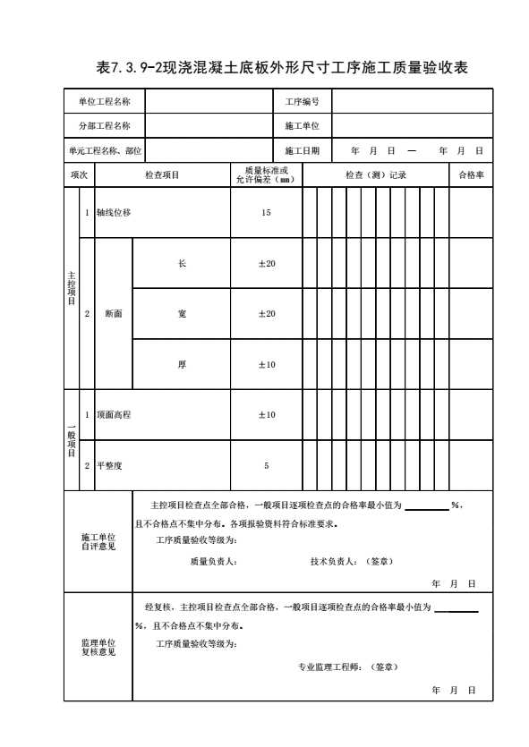 表7.3.9-2 现浇混凝土底板外形尺寸工序施工质量验收表
