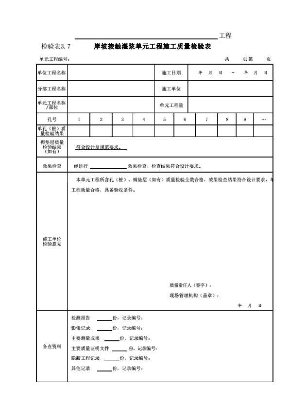 表格名称:表3.7 岸坡接触灌浆单元工程施工质量检验表