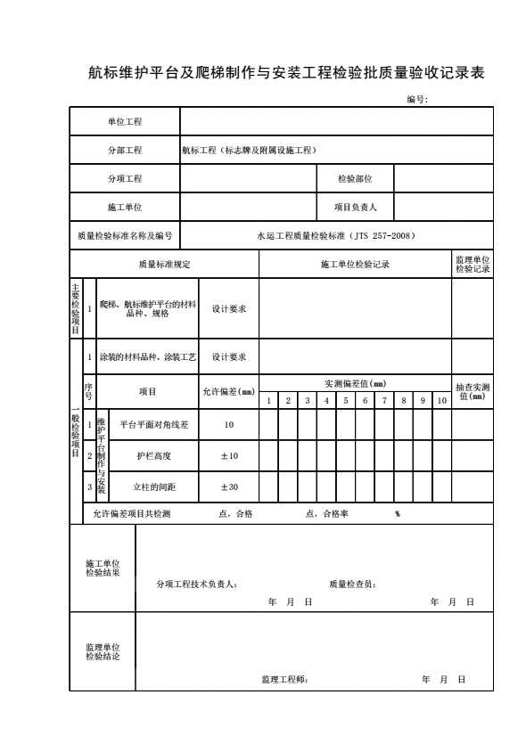表格名称:航标维护平台及爬梯制作与安装工程检验批质量验收记录表