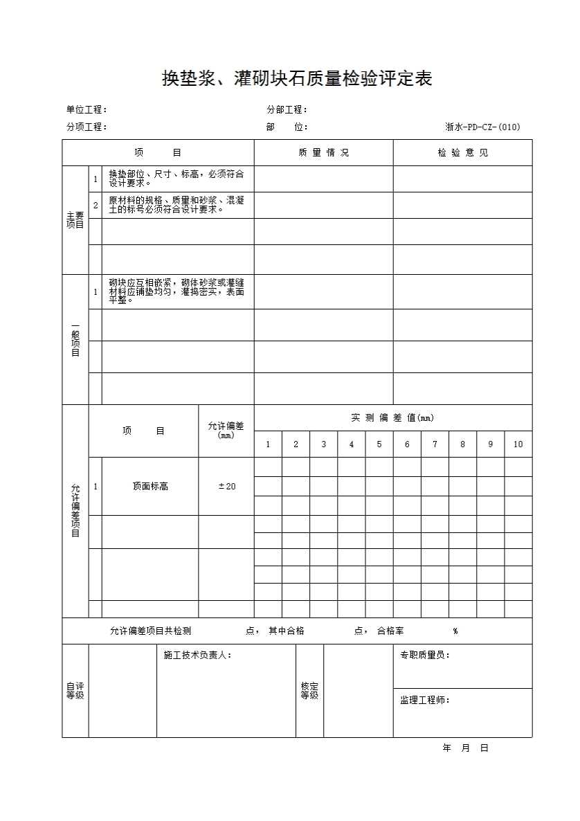 表格名称:010 换垫浆、灌砌块石质量检验评定表