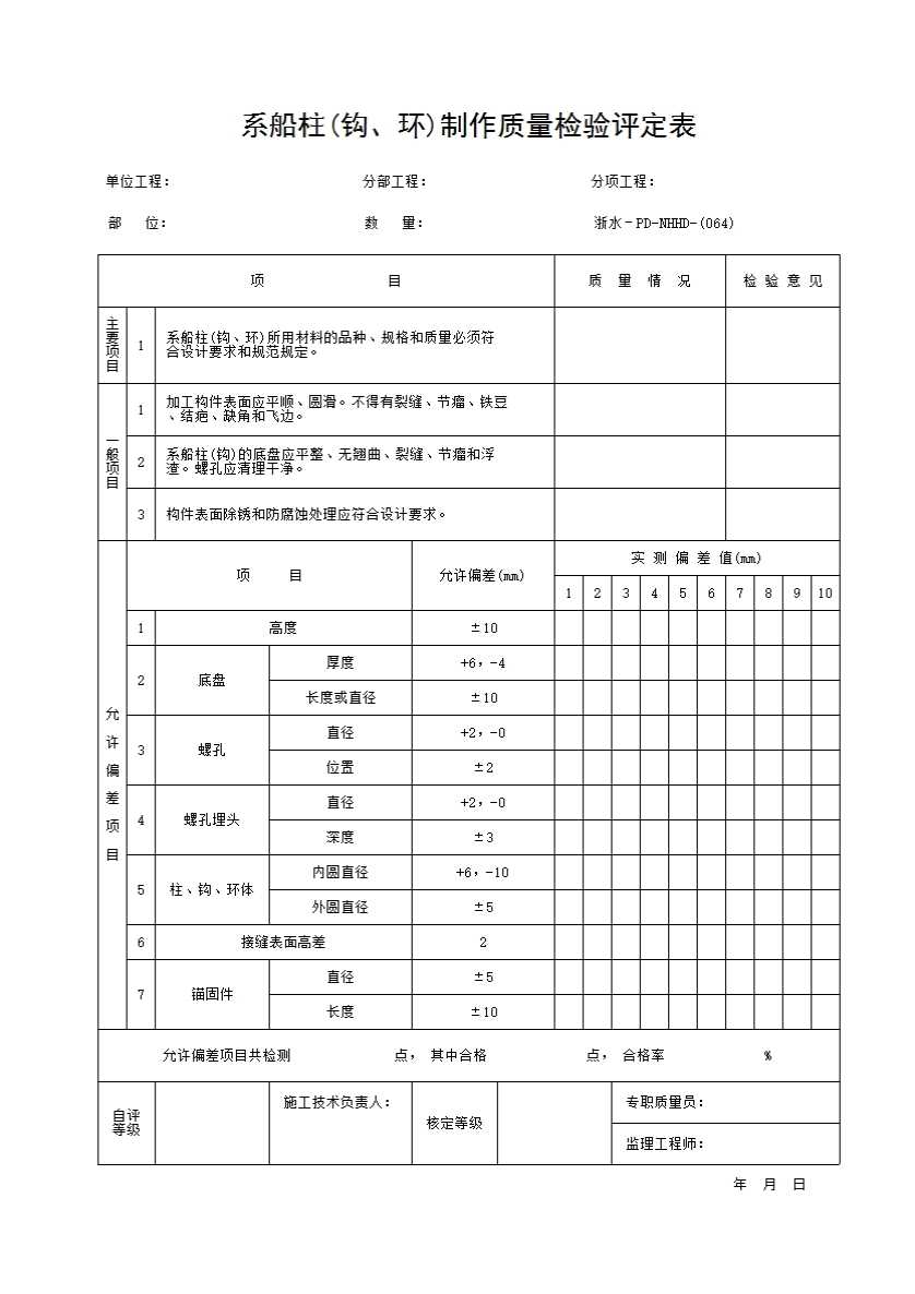 表格名称:064 系船柱(钩、环)制作质量检验评定表