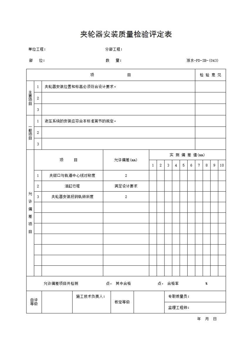 表格名称:043 夹轮器安装质量检验评定表