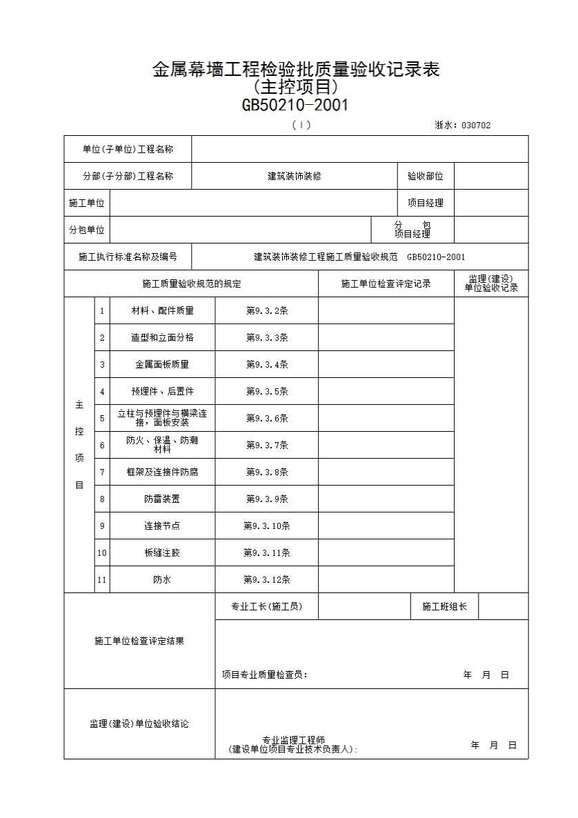 表格名称:134 金属幕墙工程检验批质量验收记录表(主控项目)