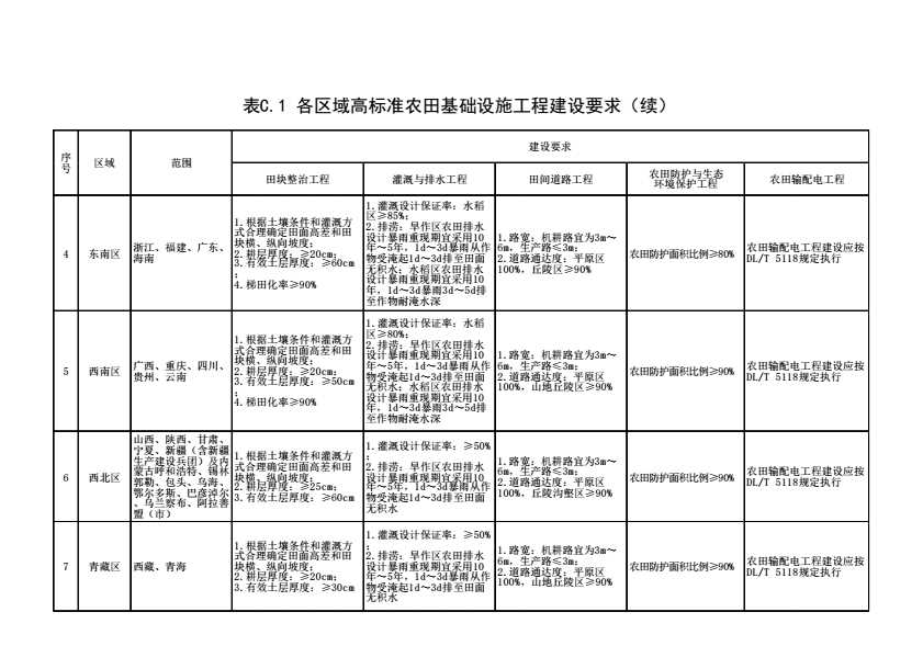 表C.1 各区域高标准农田基础设施工程建设要求