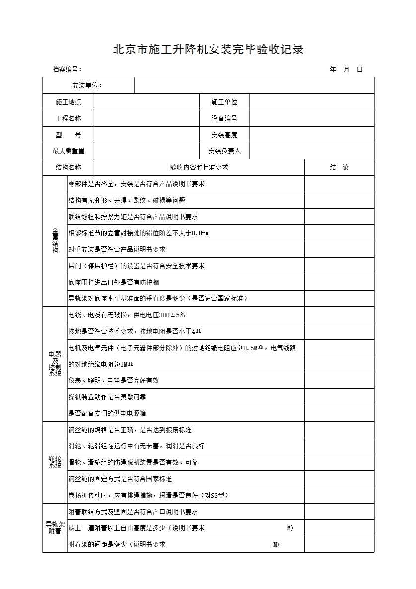 表格名称:021_北京市施工升降机安装完毕验收记录