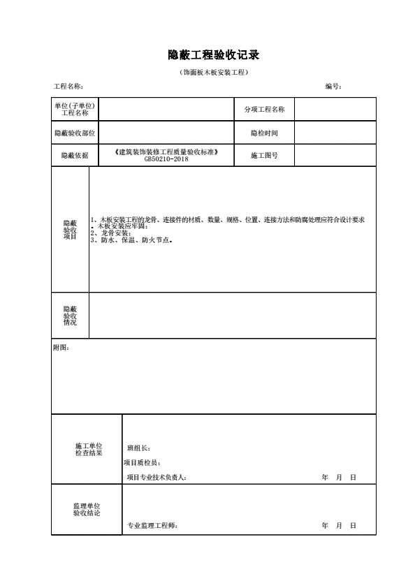 表格名称:隐蔽工程验收记录(饰面板木板安装工程)