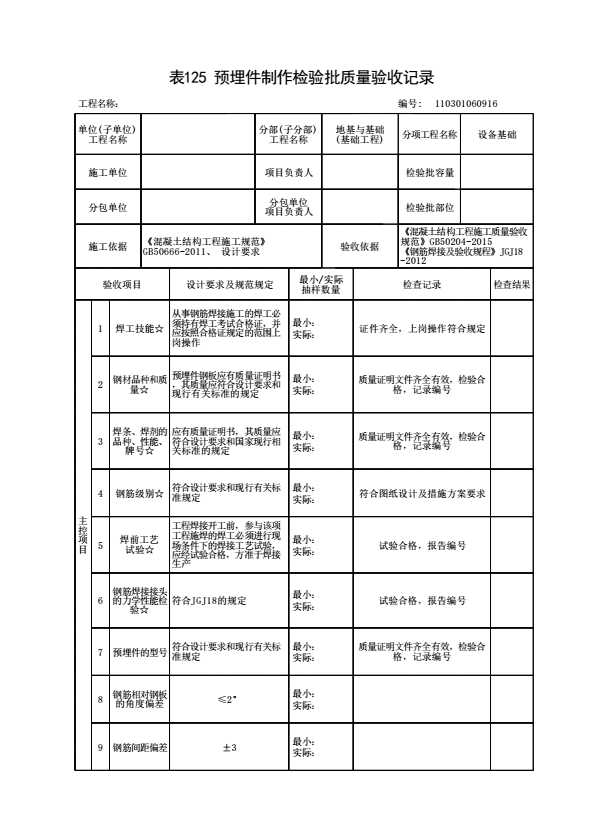 表格名称:110301060916 预埋件制作检验批质量验收记录