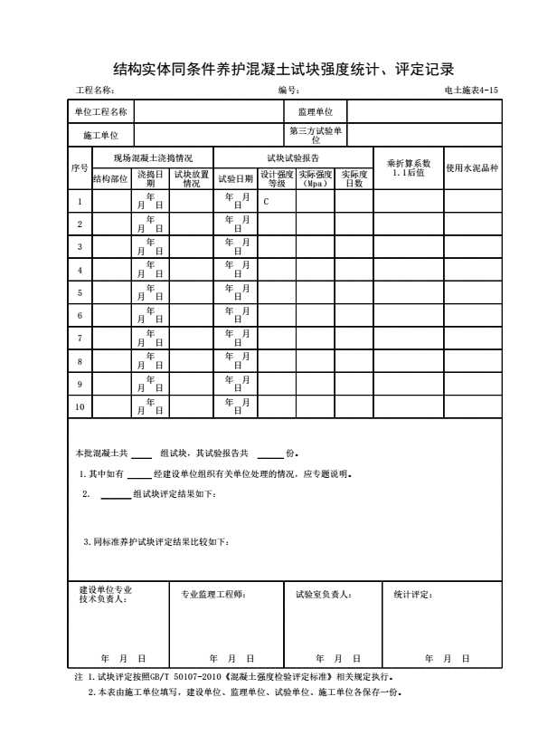 表格名称:电土施表4-15 结构实体同条件养护混凝土试块强度统计、评定记录