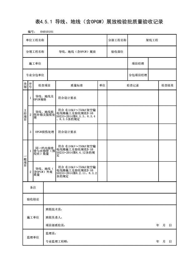 表格名称:表4.5.1 导线、地线(含OPGW)展放检验批质量验收记录
