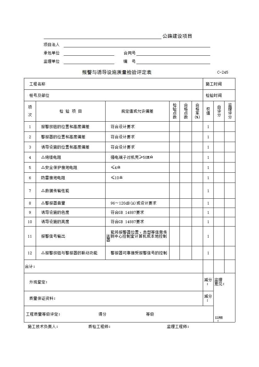 表格名称:C-245 报警与诱导设施质量检验评定表