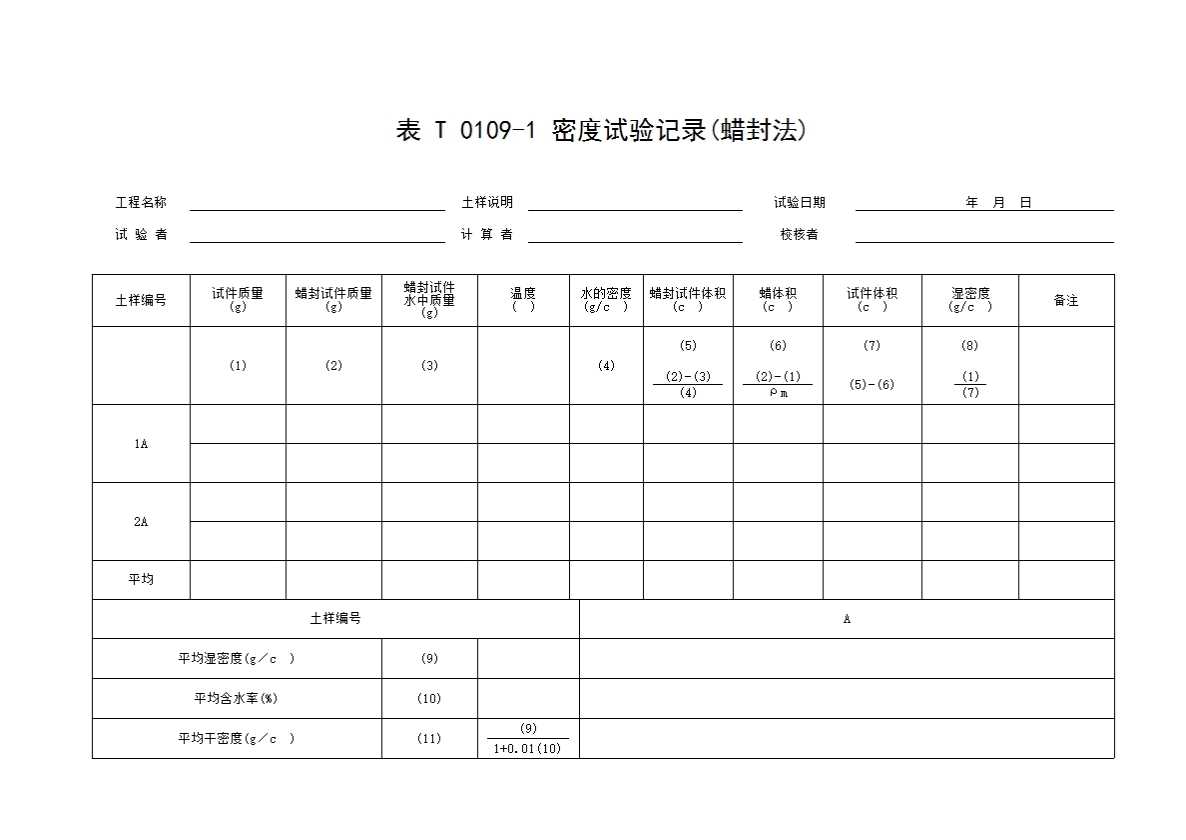 表格名称:表T0109-1 密度试验记录(蜡封法)