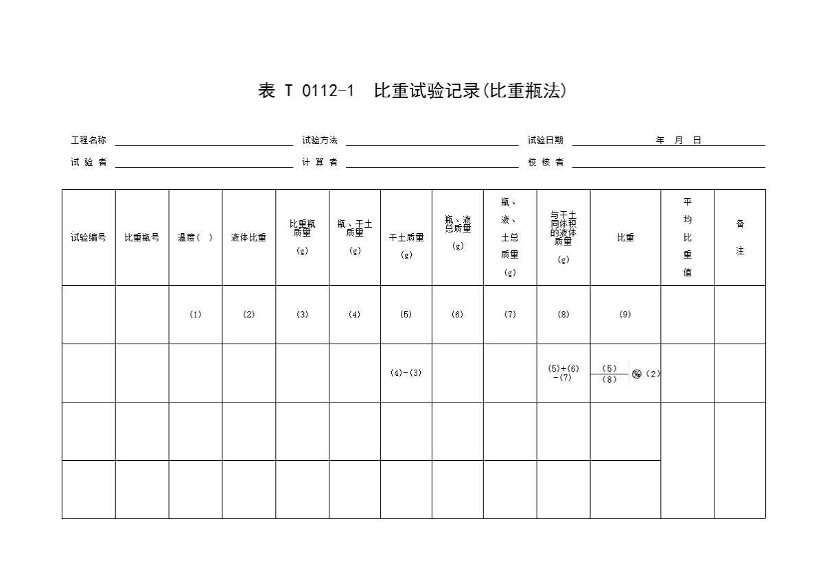 表格名称:表T0112-1 比重试验记录(比重瓶法)