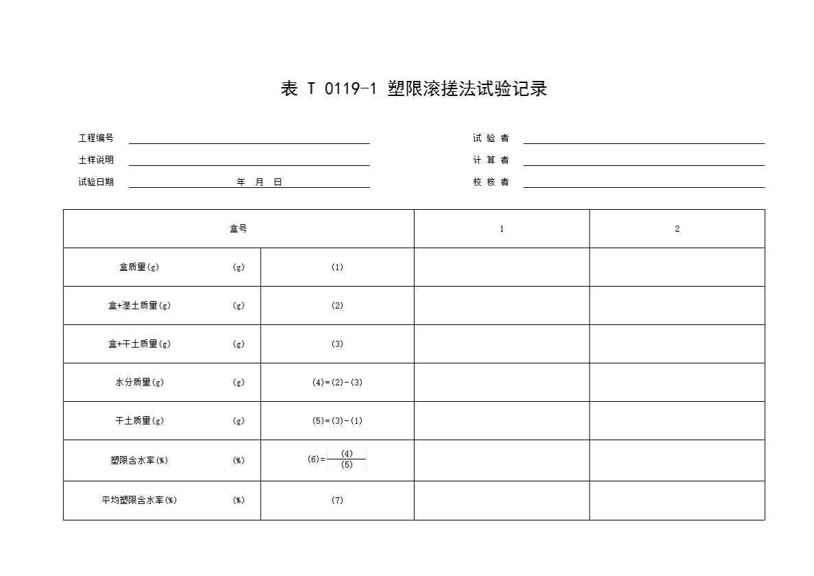 表格名称:表T0119-1 塑限滚搓法试验记录