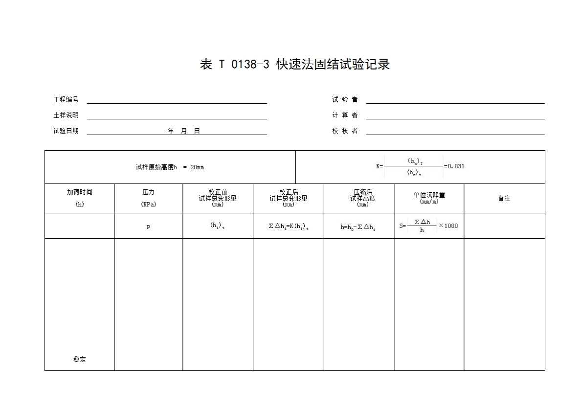 表格名称:表T0138-3 快速法固结试验记录