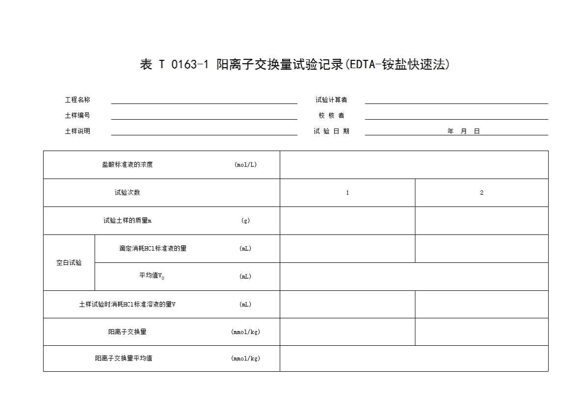 表格名称:表T0163-1 阳离子交换量试验记录(EDTA-铵盐快速法)